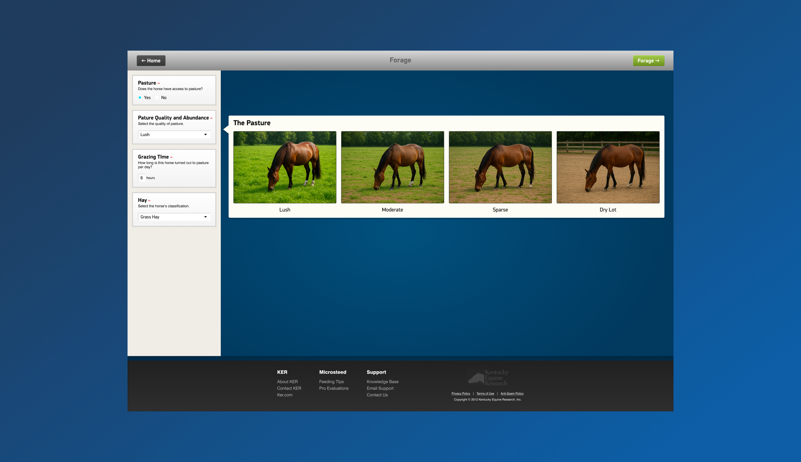 User Experience & Design: The wizard’s UI was crafted to be approachable and educational. Each step uses layman’s terms, with any technical jargon explained in plain language. For example, when asking for the horse’s Body Condition Score (BCS), the interface provides a simple graphic and description of what each score means. Helpful defaults and validation are in place – if a user isn’t sure of the horse’s exact weight, the wizard offers an estimated range based on breed and height. A progress bar at the top of the wizard shows users how close they are to completion, encouraging them to finish. The design uses KER’s branding and horse imagery to feel like an integrated part of the KER site. Throughout the process, we struck a balance between not overwhelming the user and gathering enough detail to make solid recommendations. The tone is supportive and informative, akin to having a virtual nutritionist guiding you. We also paid attention to performance; the wizard loads quickly and is fully responsive, so even in a barn on a phone, a user can easily complete it. The end result transforms what could be a daunting task (figuring out a feeding program) into an engaging online experience.