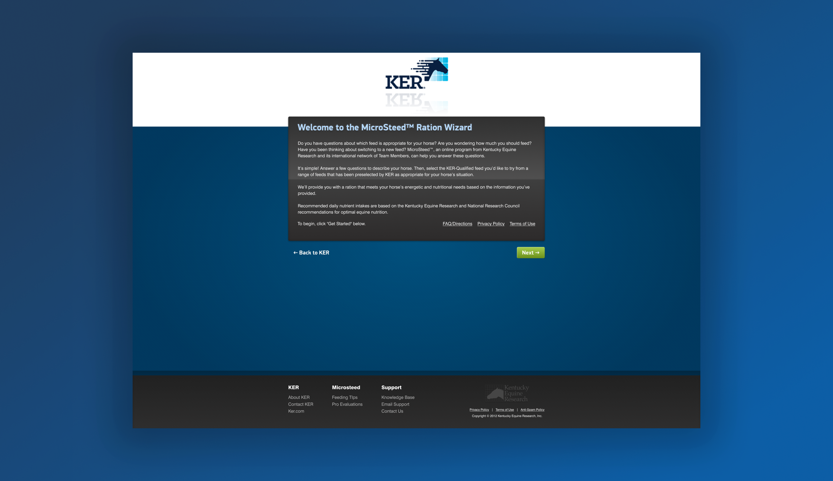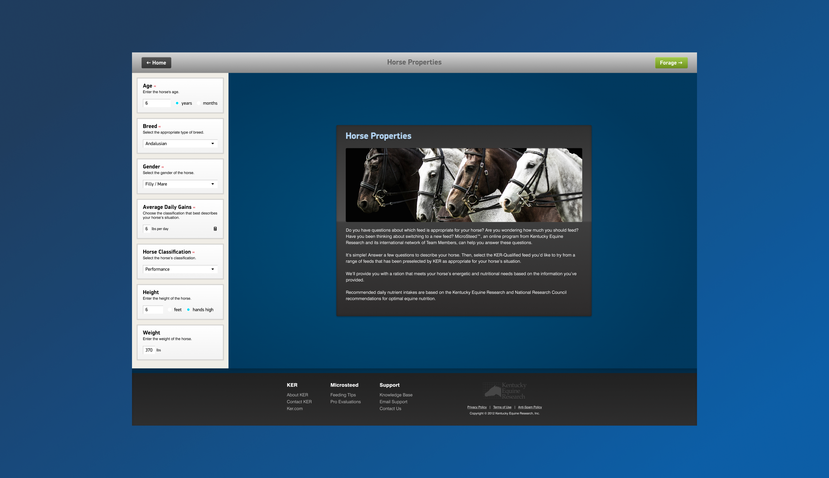 Purpose & Concept: The Ration Wizard is an interactive web application that helps horse owners create a customized feeding program for their horse. It was designed to translate KER’s nutrition expertise into a self-service digital experience. Instead of reading whitepapers or calling an expert, users get personalized, science-backed feed recommendations in minutes, for free. This tool serves both as a genuine value-add for KER’s customers and a subtle marketing funnel for KER’s feeds and supplements. By empowering users with knowledge, it fosters trust and often leads them to products that fit their horse’s needs.